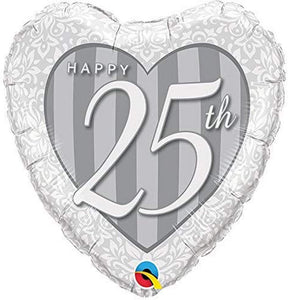 18" silver & white 'Happy 25th' Foil Balloon with damask pattern.