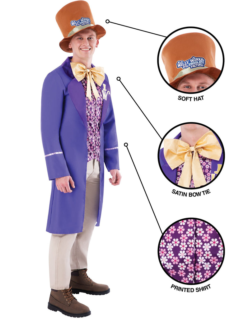 • purple Jacket with attached floral Waistcoat & gold Bow Tie.