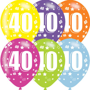 Includes six 11" bright latex balloons with white printed '40's and stars.
