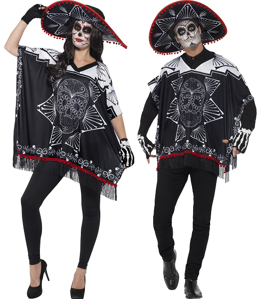 - black fabric Poncho with white sugar skull print and black tassel & red bobble trim.