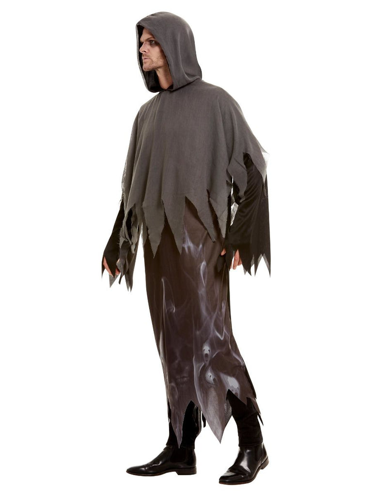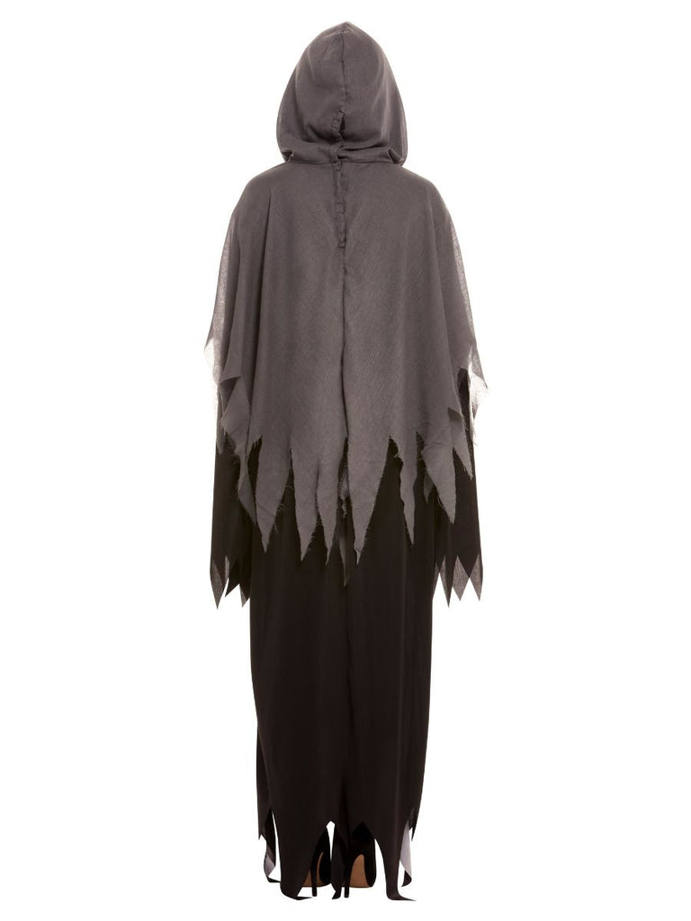 - long, black hooded Robe with long tattered sleeves & zig-zag hemline with printed ghostly faces.