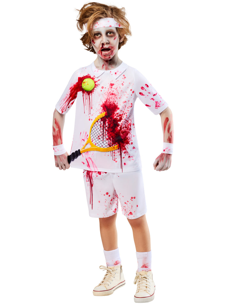 - white Top with printed blood splatter and printed tennis ball and racket with 3D felt handle.